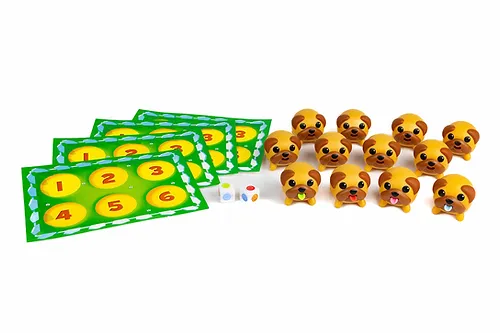 הטילו את הקוביות ומצאו את הכלבלבים המתאימים לצבע הסוכריות שעל הקוביות.